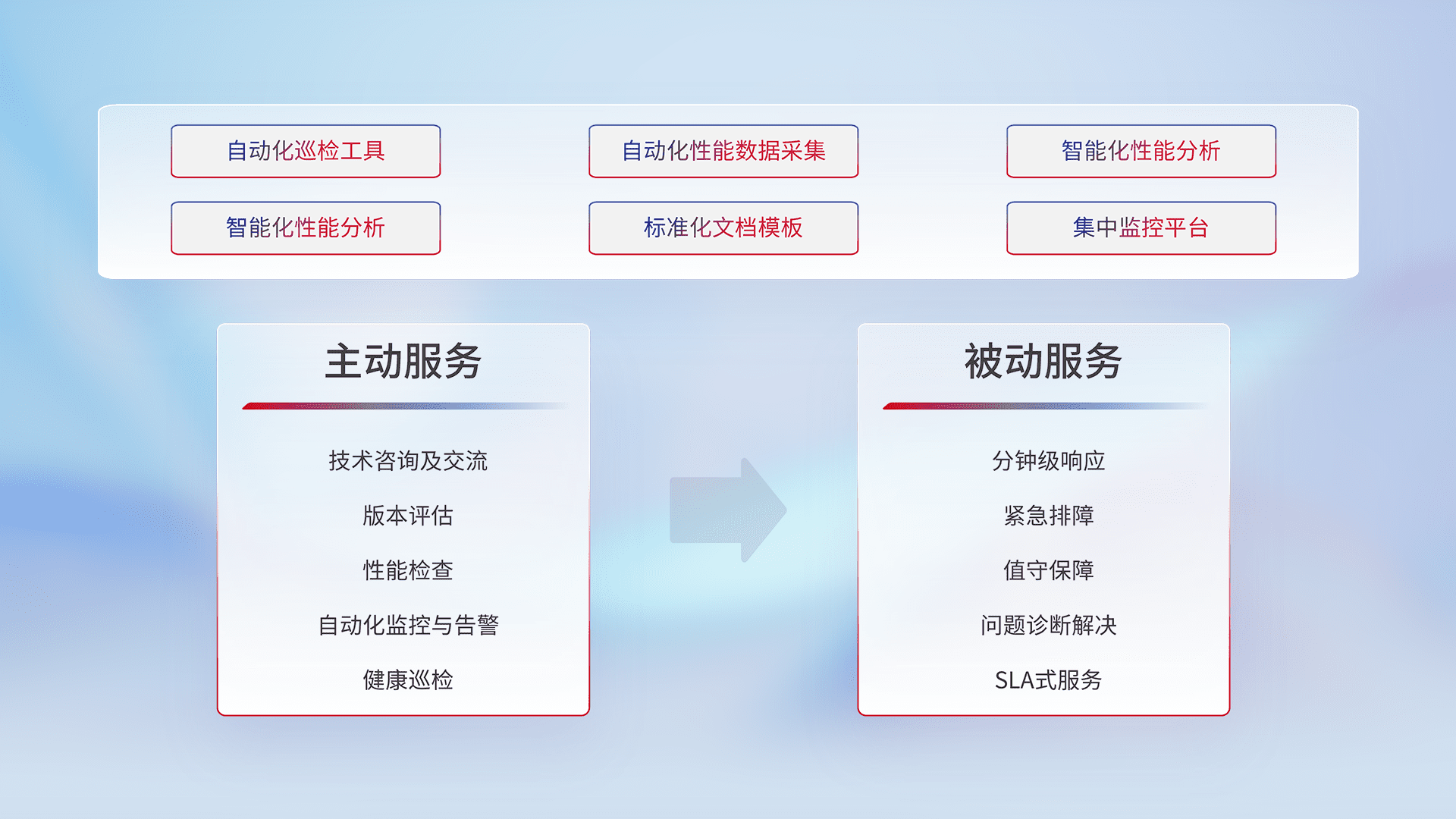智能化工具和标准化文档,,保障服务质量,,提供主动服务(包含技术咨询、、、、版本评估、、、、性能检查、、自动化监控与告警、、健康巡检)和被动服务包含(分钟级响应、、、、紧急排障、、、、值守保障、、问题诊断解决、、SLA服务)。。